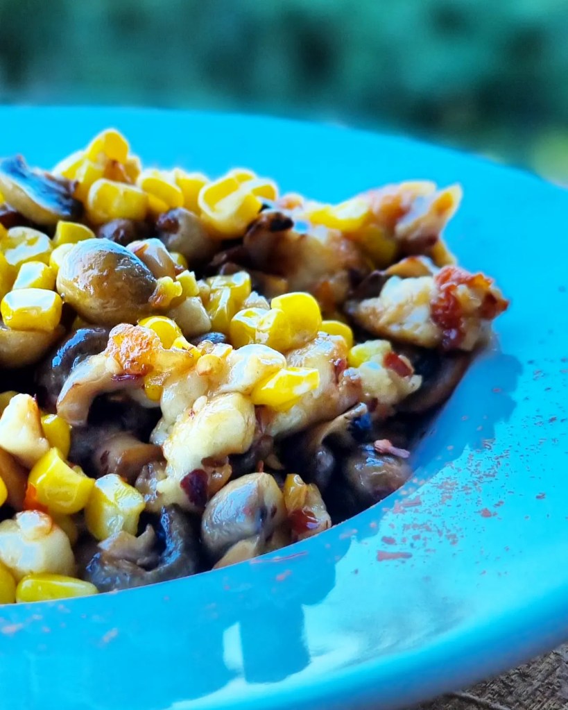 Här ser vi stekt halloumi med champinjoner och majs tillsammans med salt, chiliflakes och vitpeppar. Detta ska blandas ihop med körsbärstomater, skalad gurka och rödpaprika tillsammans med riven cheddar och en mix på salsa.