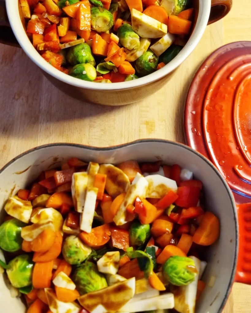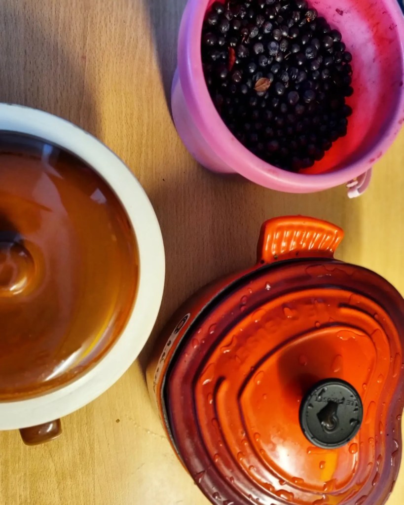 Till detta blir det ett långkok på viltgryta med morrötter, palsternacka, brysselkål, gullök, salladslök, paprika, rödvin, svartvinbärsjuice, enbär, ramslök, salt, mald svartpeppar och en slev krossade tomater. Stek lök och vänd ner hackade grönsaker innan du öser ner vätska och låter det koka ett par timmar