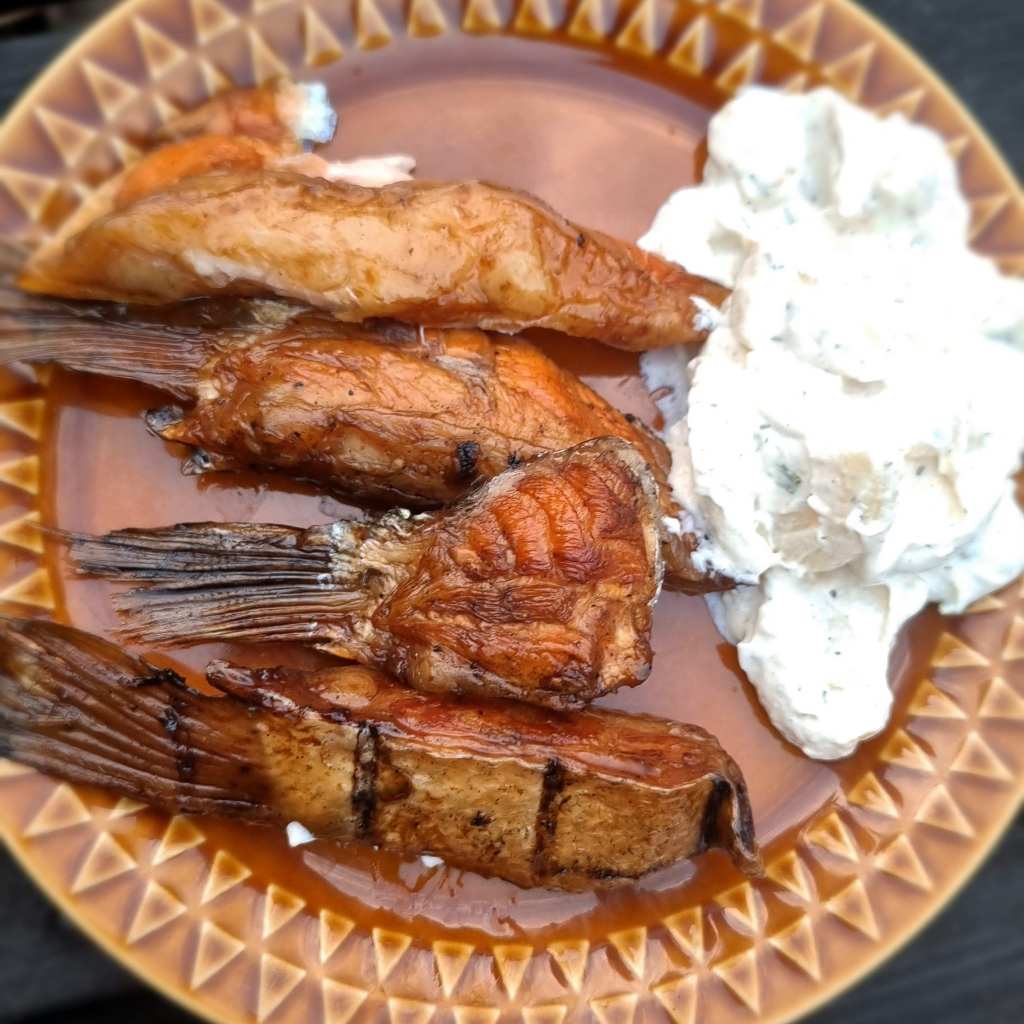 Inget bör förfaras på en fisk. Köttet kring fenorna är extra fet och smakrika. Laxfenor har väl blivit en delikatess på senare år samt för att återuppliva svunna tider från våra fäder.