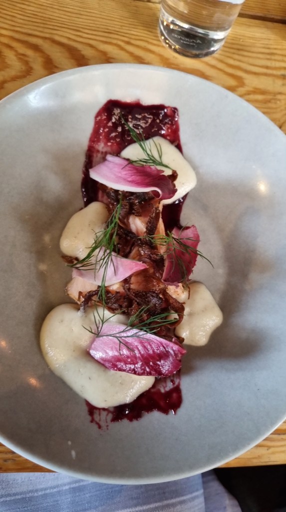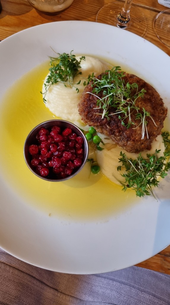 med konjaksglaze, Västerbottensostkräm, picklade hjortron, hasselnötter & mangold.