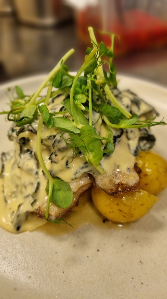 Idag smörstekte jag gös. Att servera gös påminner mig om Hullsta i Bergvik uppe i Hälsingland. Min morbror har lärt mig det mesta gällande fisk. Det är ett fint arv jag har med mig men som jag tyvärr inte har förvaltat tillräckligt mycket. Till denna anrättning stuvade jag svartkål till förbannelse och rikligt med västebottenost. När jag stekte ala minut under lunchen så ångrade jag mig men det var försent. En lunch vill dom flesta ha snabbt men bra mat tar tid?