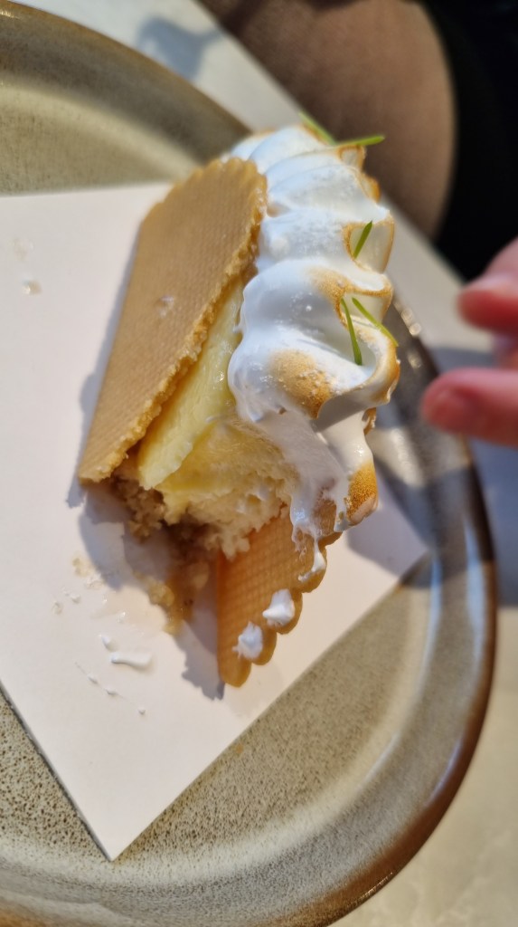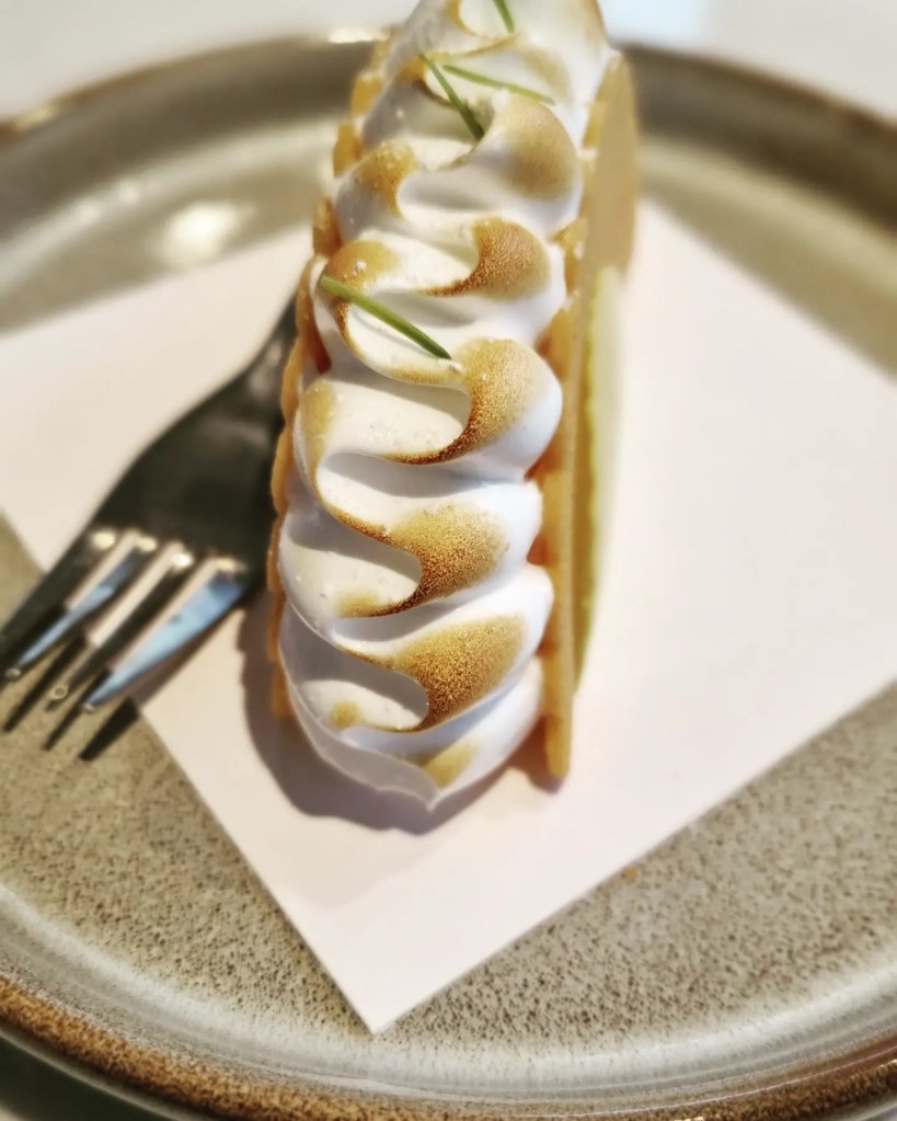 Deras egna version på tarte med lemoncurd, citronmousse, granskottscitron på tunnbakat-liknande rån och vitchoklad. Botten är på Chufa som är en stärkelserik nötliknande knöl från familjen halvgräs. Den kallas även tigernöt eller jordmandel men är trots namnet ingen nöt. Helt fantastiskt att man har skapat något bra och gott på det. Stor eloge.