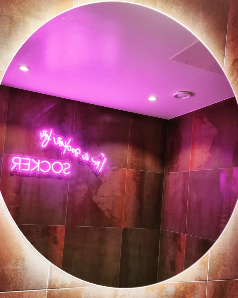 När du sen besöker bekvämlighetsfoajeen så vet jag inte om det är tacky eller väldigt jäkla bra med ett break av den stilrena inredningen som fortfarande är fin och lite ruff, alltså ruffie på toan.