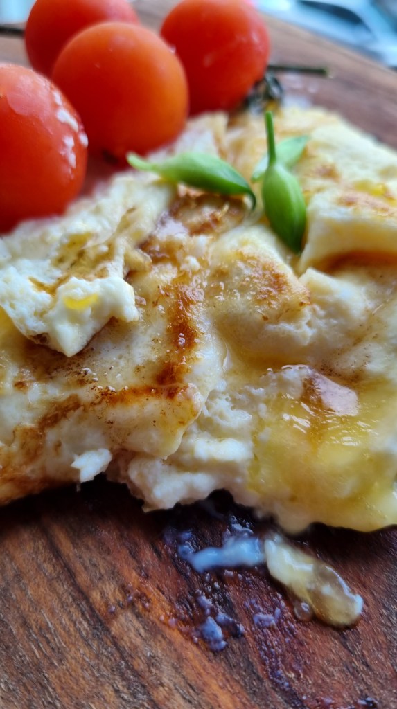 Jag har gjort en riktig krämig omelett på ägg, laktosfri crème fraîche och salt. Klicka ner smör och låt pannan stå på svag värme, häll ner smeten och låt den gå ett tag. Riv över en massa ost och vik ihop. Till denna rätt blev det ramslöksknoppar, brynt smör och cocktailtomater.