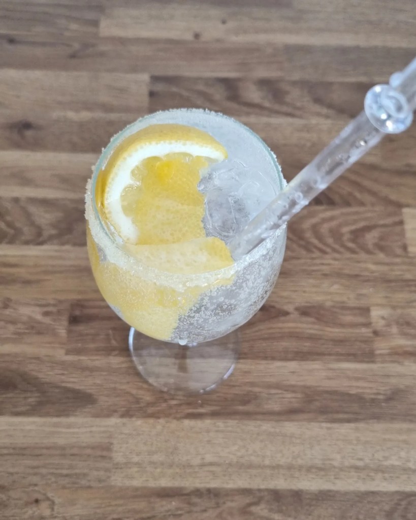 Skalad citron, sockerlag, vodka, is och sprite. Ringla runt citron på kanten så du får fast sockret