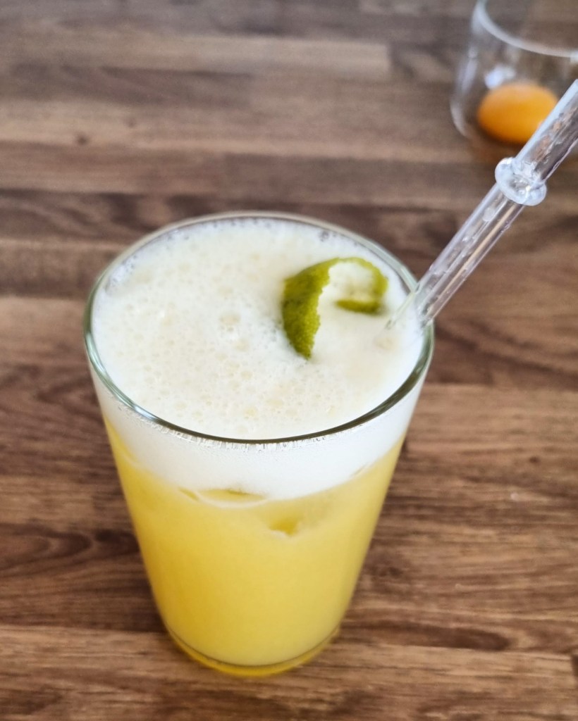 Vodka, lime, äggvita, mango och is. Mera än så behövs inte. Äggulan sparas såklart till brunchen