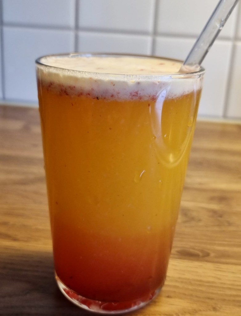 Skakad jordgubbsdrink med mango, jordgubbar, citronlag, äggvita, vodka och is.
