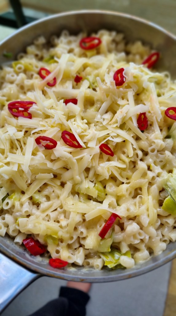 Fräs olja och smör i en panna, strimlad purjolök och låt det få svettas, klicka ner en tesked dijonsenap, skvätt vitvinsvinäger och ca 1 dl grädde och rör om. När pastan är klar, häll ut vattnet och ner i pannan. Rör om, salta och peppra och riv över rikligt med ost. Oftast sparar en oststumpar eller kanter som jag fryser in för just sådana här tillfällen.