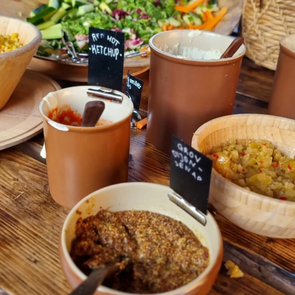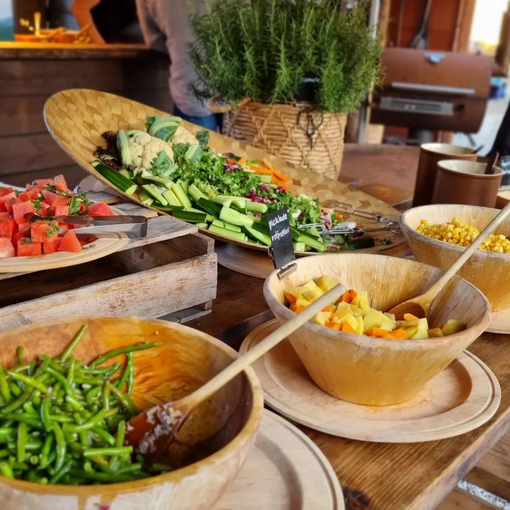 Här finns blandannat potatissallad, haricots verts, rotfrukter, melon och stenhällsbakat bröd.