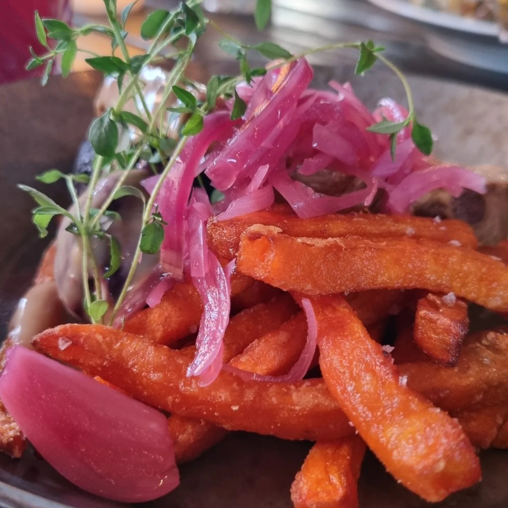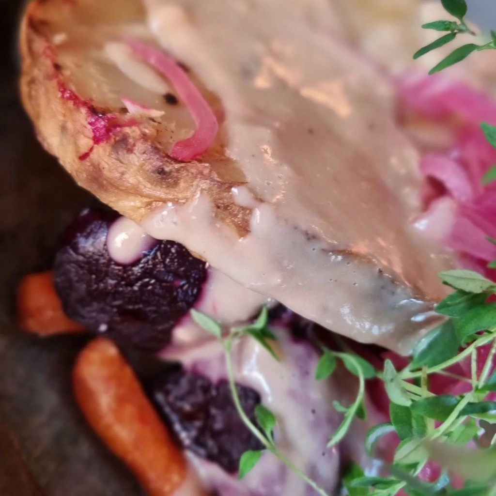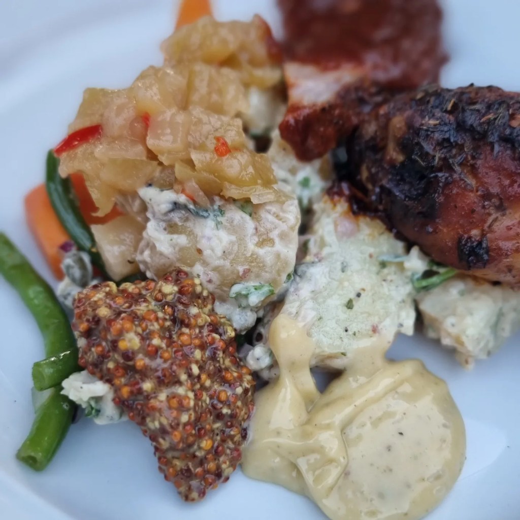 För den som inte äter kött finns det grillad lax, portabello, rödbetor med picklad rödlök och sötpommes på gotländska närproducerade råvaror.