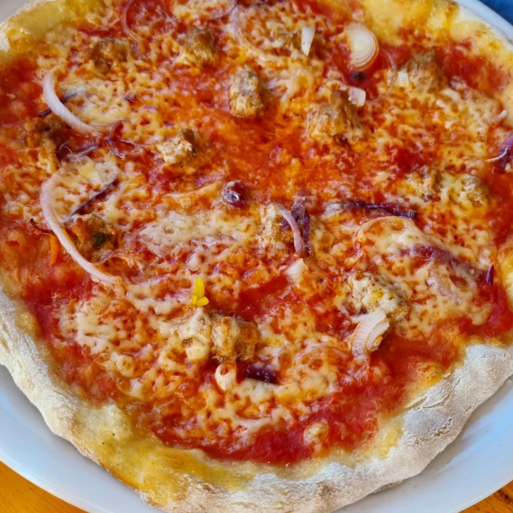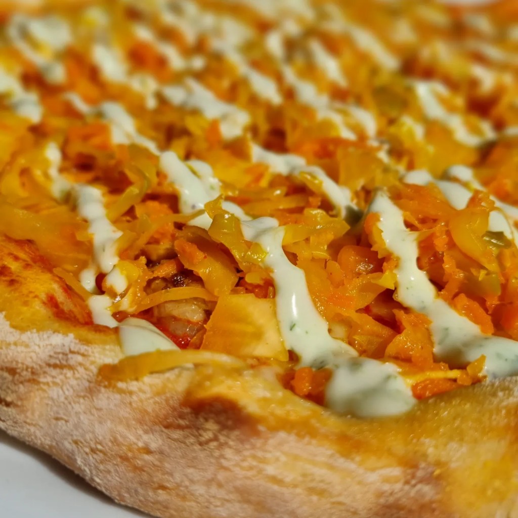 Pizzadegen består av emmer så själva pizzan är inte gigantiskt platt eller stor men du blir garanterat mätt. Här skådar ni pizza med rabarber, sparris och örter, kryddig korvfärs eller fläsksida med kimchi och majjo. Köttet på pizzan är Gotländskt och ni som kan ert emmer vet att det har ett högt näringsinnehåll och lite matigare