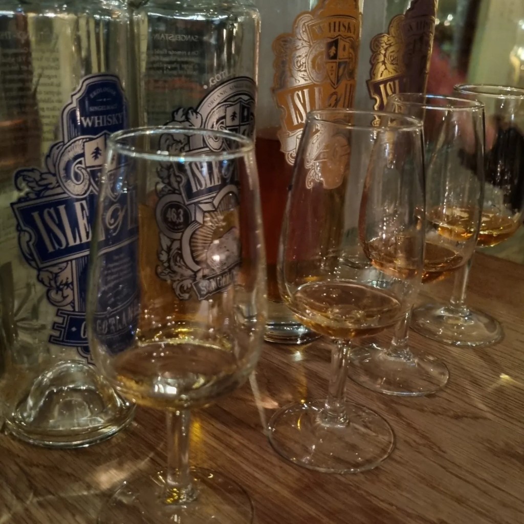 Den lilla nyfikna var nyfiken på Gotländsk whisky så det fick bli hennes efterrätt. På bordet står fyra flaskor med Gotländsk whisky. Hon satte alla rätt på smak och doft. Min favorit på doft är Kyllaj. Som naturligtvis bara är en special edition.