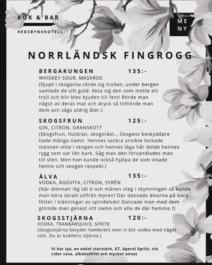 Idag åker vi till Edsbyns Hotell för att dricka norrländsk fingrogg. Hantverket i en drink är lika viktig som i mat. Både med och utan alkohol. På Edsbyns Hotell njuter du drycker och drinkar skapat från naturens skafferi.