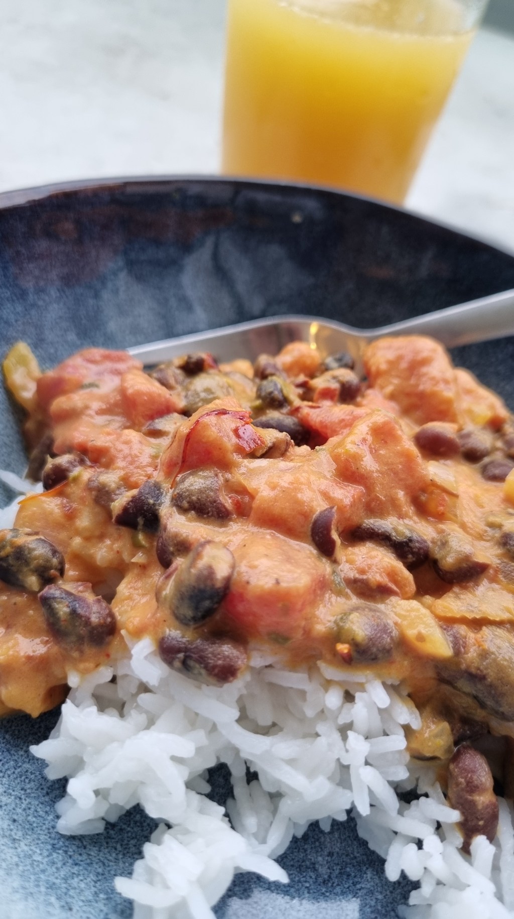 Låter detta få puttra ihop och innan servering till riset så klickar jag ner en nypa saffran och rör om. Färsk basilika eller persilja höjer smak, en klick laktosfri crème fraîche skapar syra på topp.