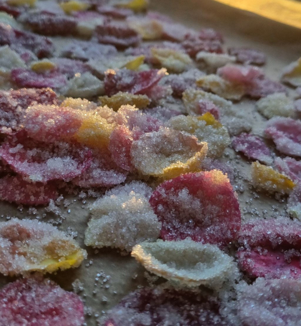 Välj ut fina, nyutslagna rosor, skölj dem och låt dem torka upp på en kökshandduk. Vispa äggvita hårt, pensla över, strö över socker och låt rosenblanden ligga på ett bakplåtspapper över natten.