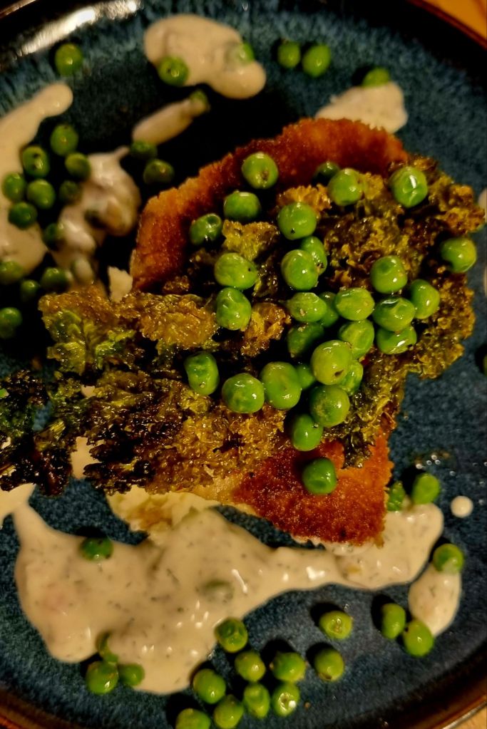 Jag vänder skivorna i mjöl, ägg, panko ett par gånger. Hettar upp smör och steker. Under tiden gör jag potatismos med grädde och smör såklart. Sjuder på gröna ärtor med olivolja, svartpeppar och salt. Häromdagen gjorde jag en stor sats ostronvinegretten som jag tar av och blandar ner i laktosfri crème fraîche, yuzy, vitpeppar och dill.