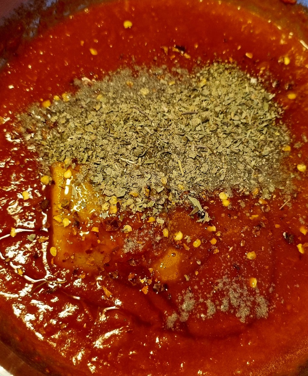 Jag skållar tomater och blandar ner lite extra krossade tomater, schalottenlök som har mjuknat upp i olja, vitlök, persilja, chili, torkad chili, sirap, salt, mald svartpeppar och oregano. Jag låter detta få koka ihop med en halv lime. Sen får det sjuda ett par timmar. Gör helst en stor batch och frys in i stora isformar så är det bara att ta fram vid senare tillfälle.