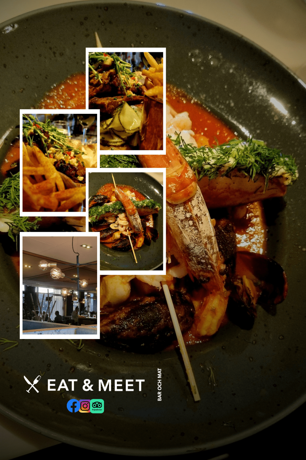 Jag har hittat krogens paradrätt, mört revbensspjäll med grön äppelsalsa, dill- och citronmarinerad gurka, BBQ-sås och chipotlekryddade pommes som serveras snyggt och personalen presenterar upplägget som om du satt på Operkällaren. Jag tycker om när personalen berättar vad som ligger på tallriken, det skapar det här lilla extra intresset. Om ni ska avnjuta en skaldjursgryta inne i stan så är det på Eat & Meet. Här serveras en ”hållkäften” skaldjursgryta med torsk, scampi och musslor i en tomatvinsås som serveras med aioli och knaprig focaccia.