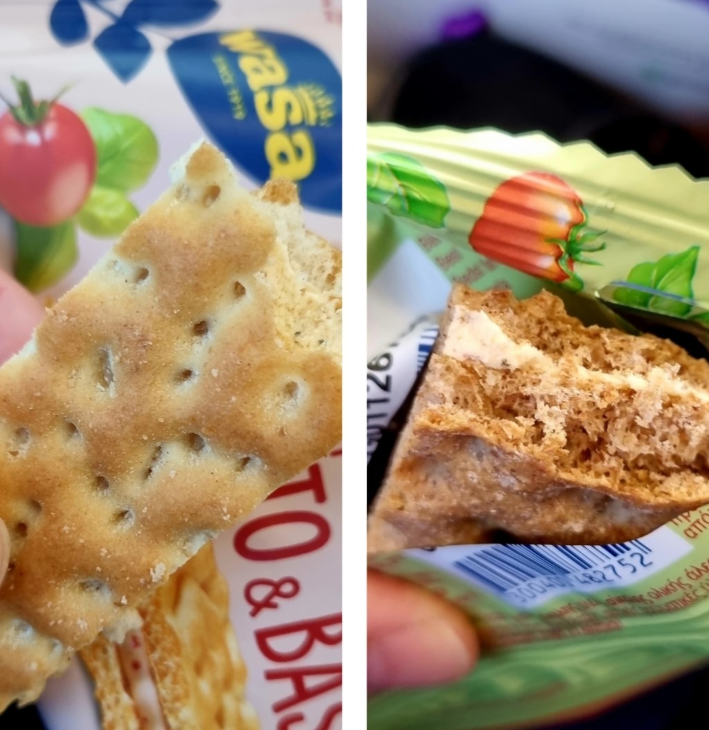 Plötsligt slår hungern till i panik? Hur många tänker på att bre en smörgås att med sig i väskan? Inte jag. Men nu hade jag ett par färdiga från Wasa med smak på tomat och basilika i veteknäcke. Jag vet inte om jag skrev tidigare om någon annan smak men det här var gott. Det här kan jag tänka mig att fortsätta att köpa i panikens hunger och faktiskt tycka att det är gott.