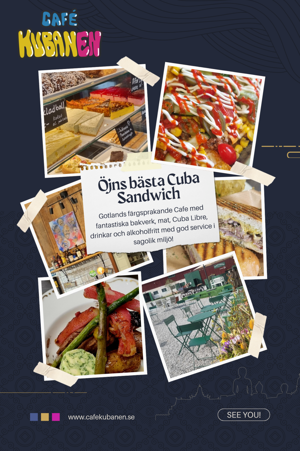 Café Kubanen är nog den mest färgstarkaste och gladaste Bistro och cafeverksamheten med mat, drinkar och bakverk på Öjn. Det här är ett perfekt utflyktsmål för alla som älskar cheesecake med mojito, mango, lime och jordgubbar eller varför inte en annan storfavorit som Kubansk kladdkaka med banan, rom, kokos och dulce de lece.