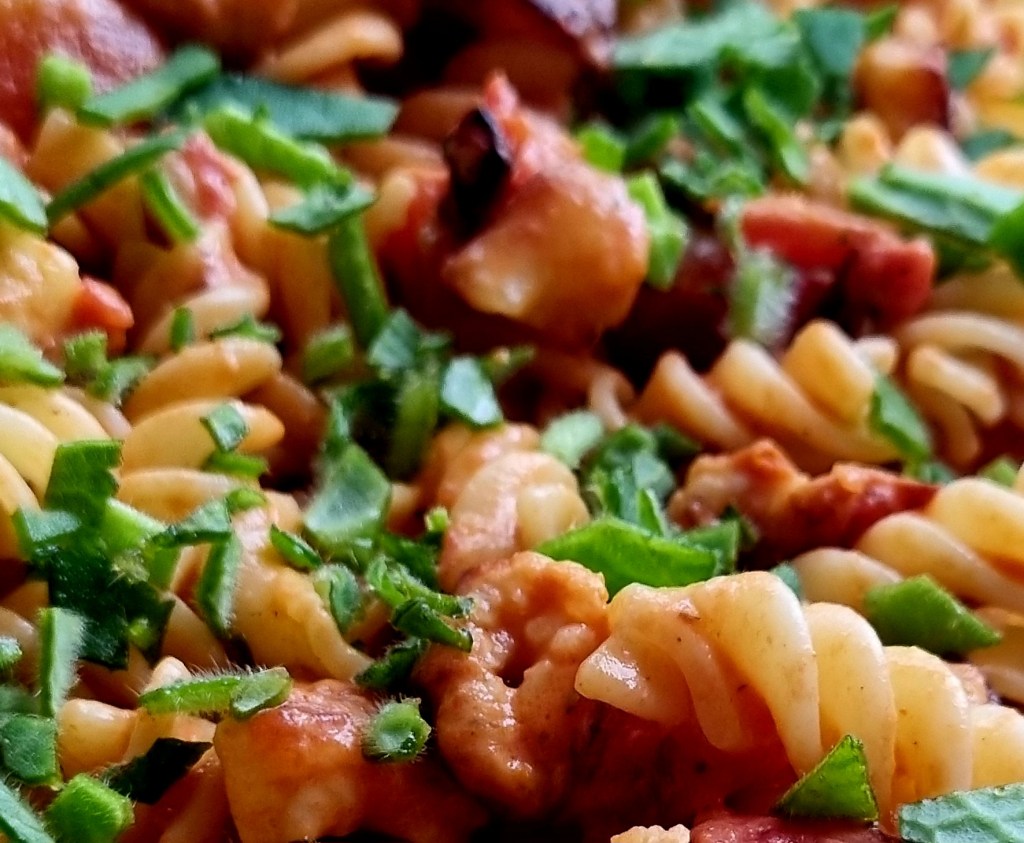 En smakrik pastagratäng där stekt halloumi möter en långkokt tomatsås som mixas slät och rörs samman med Philadelphiaost för extra krämighet. Allt blandas med pasta och kryddkarlbergare (en kryddig smakbärare, t.ex. en växtbaserad färs eller egen kryddblandning), toppas med ost och gratineras i ugn tills ytan är härligt gyllene.