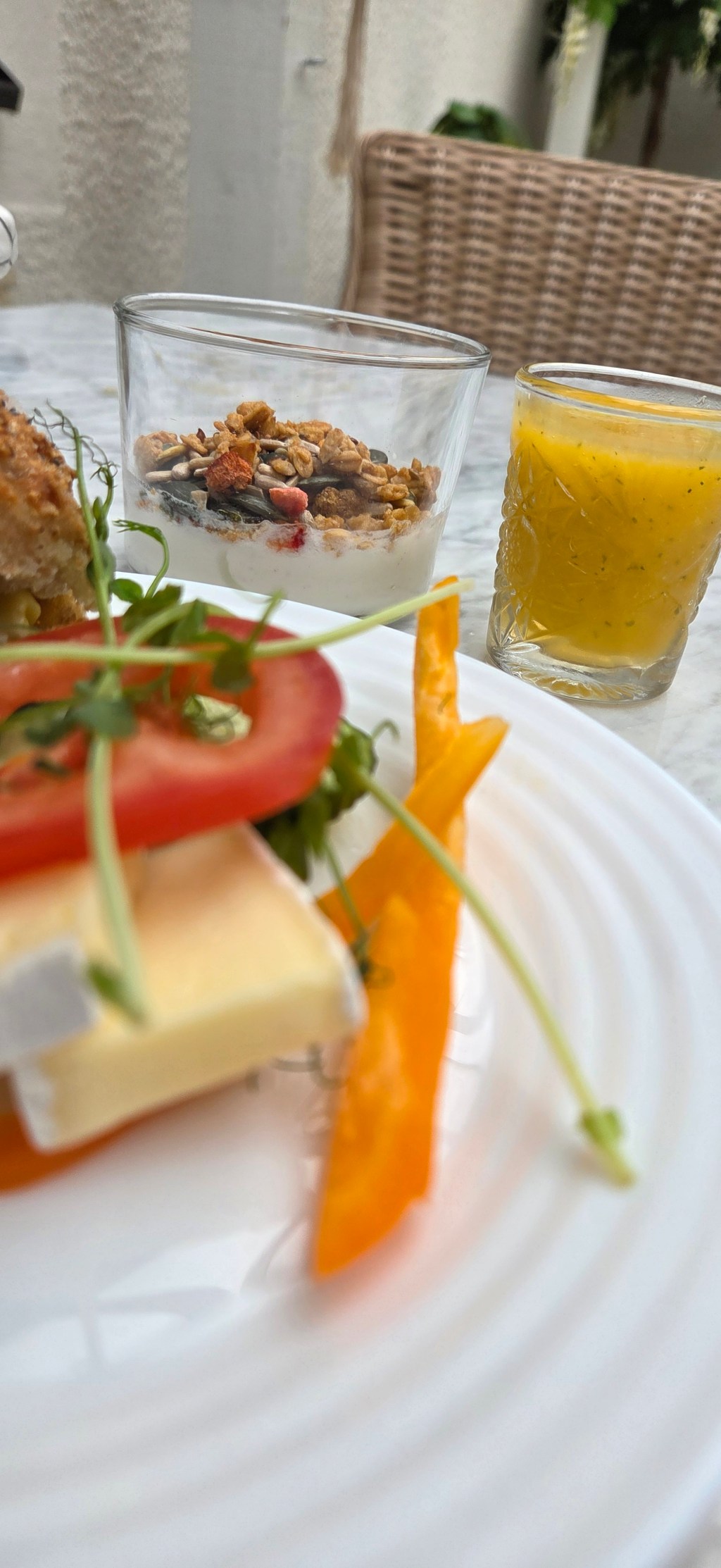 Små glas med fräscha smoothies, yoghurt serverad i eleganta glas toppade med passionsfrukt, frukt och bär. Parmaskinka och smakrika ostar, kokta ägg och nybakade frallor, dekorerade med vallmo och flingsalt, varje detalj kändes omsorgsfullt vald för att förhöja upplevelsen.