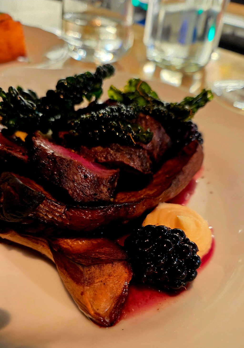 Jag åt hjort med enbärssås med smak av madeira, potatis pavé, king oyster-svamp, selleripuré och picklade björnbär. Allt var så gott att jag nästan slickade tallriken, med gaffeln. Brasserie Maison fortsätter att leverera så enkelt är det.