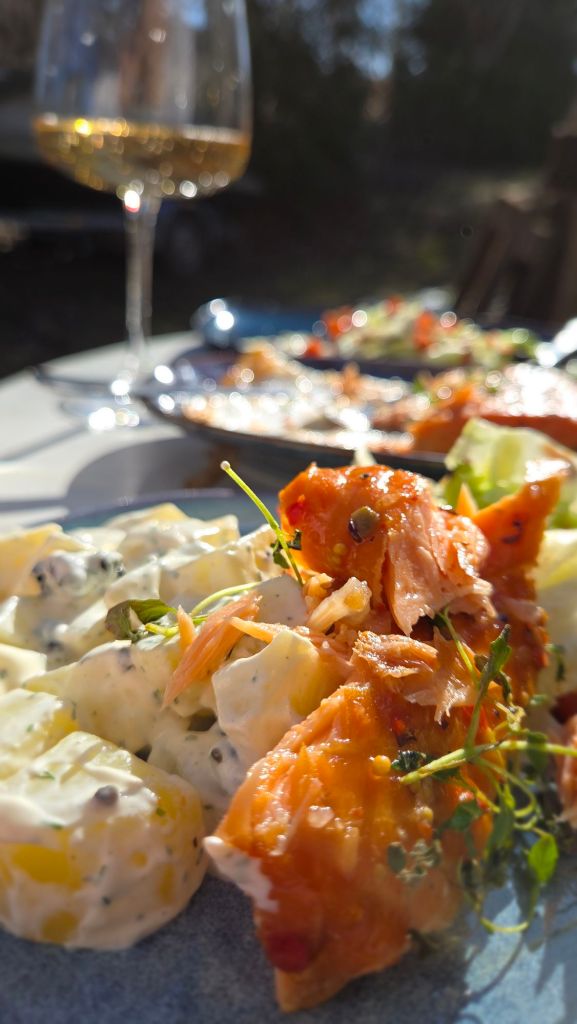Idag blev det en liten minibuffé, alspånsrökt lax med potatissallad på rostad kapris i smör som fått gå torr, majonnäs, laktosfri crème fraîche och kryddor. Till det en fräsch sallad och en alkoholfri, mousserande dryck på vita vinbär från Rudenstams Gårdsbutik & Kafé.