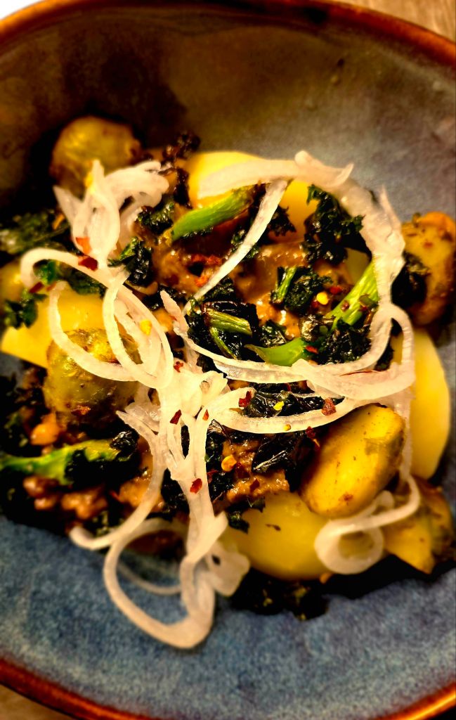 Då var renskaven framtagen ur frysen. Lite skivade champinjoner, finhackad rödlök och vitlök är redo, och potatisen ska stekas. Nu återstår bara den stora frågan, ska jag göra en sås på messmör, eller satsa på gelé och crème fraîche? Stora beslut så här en söndag. Det blev på laktosfri grädde och messmör som toppas med friterad grönkål, inlagd silverlök och smörstekt brysselkål med lite chiliflakes.